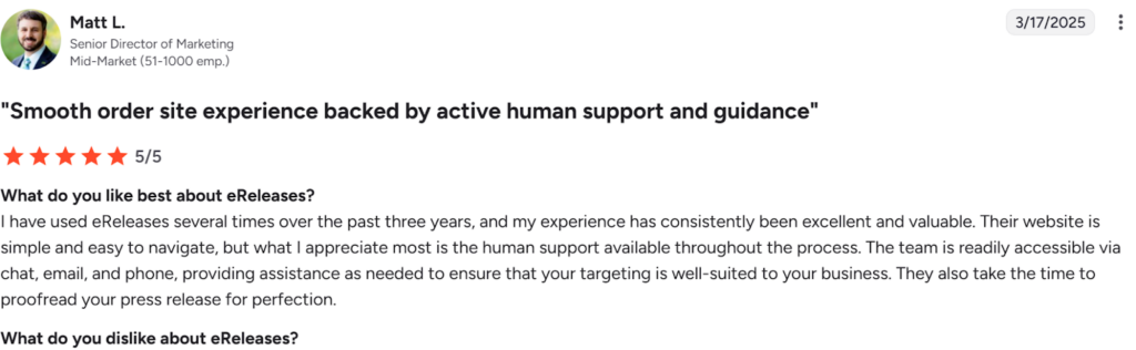 Another long-time user, who has relied on eReleases for several years, praised the company for its consistent quality, ease of use, and personal touch. From live chat to phone and email, the support team is accessible throughout the process and even proofreads press releases to ensure they are polished before distribution.