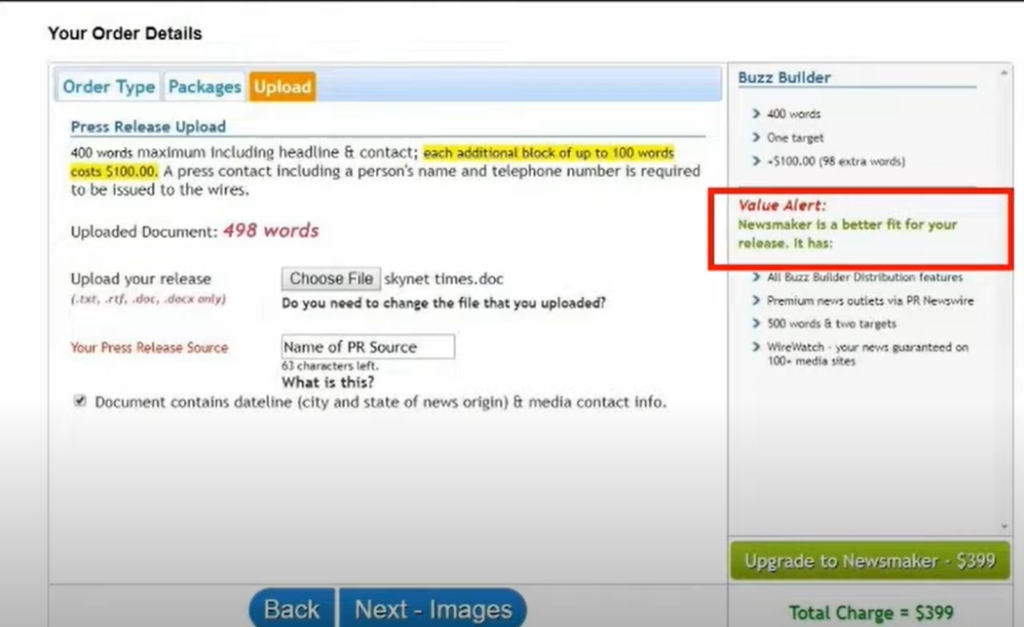 - Pricing is tiered to suit different needs, with Buzz Builder ($399), Newsmaker ($499), and PR Pro ($699), each varying by word count, industry targets, and reporting features.