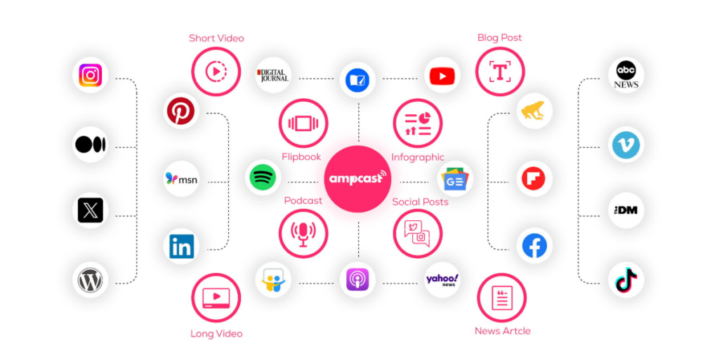 - Ampifire takes a different approach entirely, transforming single announcements into multi-format campaigns distributed across dozens of platforms.