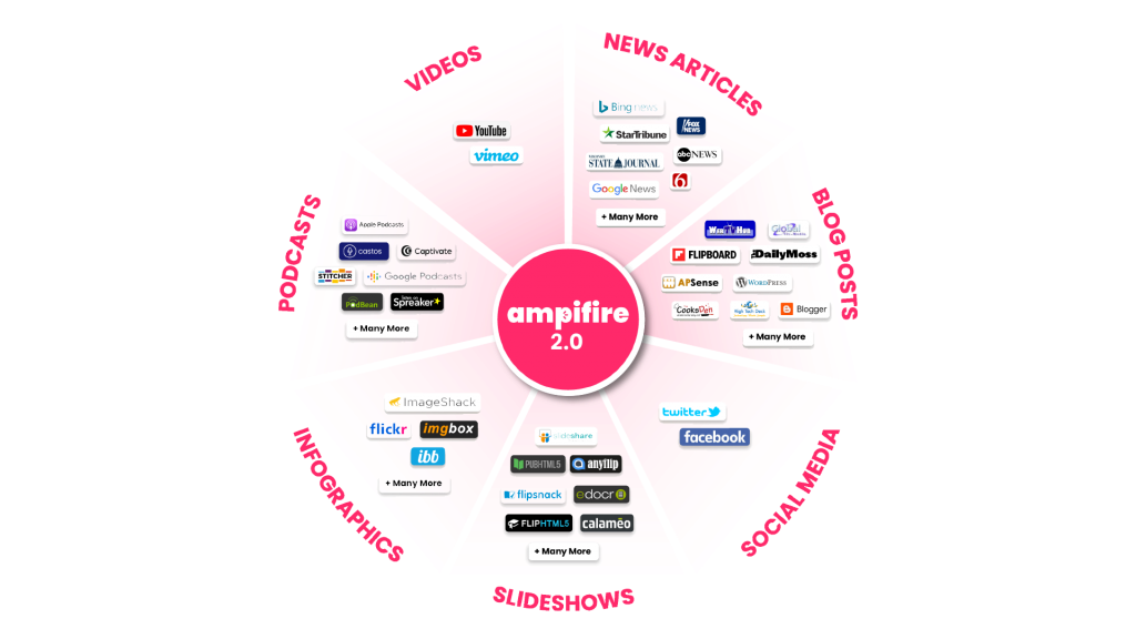 AmpiFire, using its innovative Ampcast Technology, makes this possible by transforming a single announcement into eight different content formats: news articles, blog posts, interview-style podcasts, long-form videos, short-form videos, infographics, slideshows, and social posts.